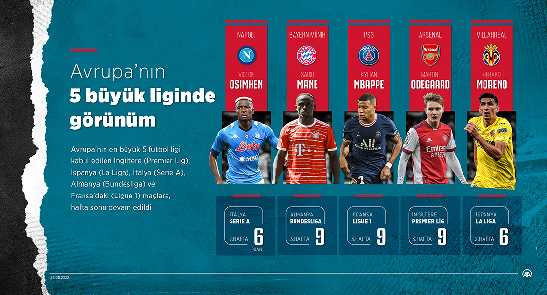 Avrupa'nın en büyük 5 futbol ligi kabul edilen İngiltere (Premier Lig), İspanya (La Liga), İtalya (Serie A), Almanya (Bundesliga) ve Fransa'daki (Ligue 1) maçlara, hafta sonu devam edildi. (Grafik: Kemal Delikmen/AA)