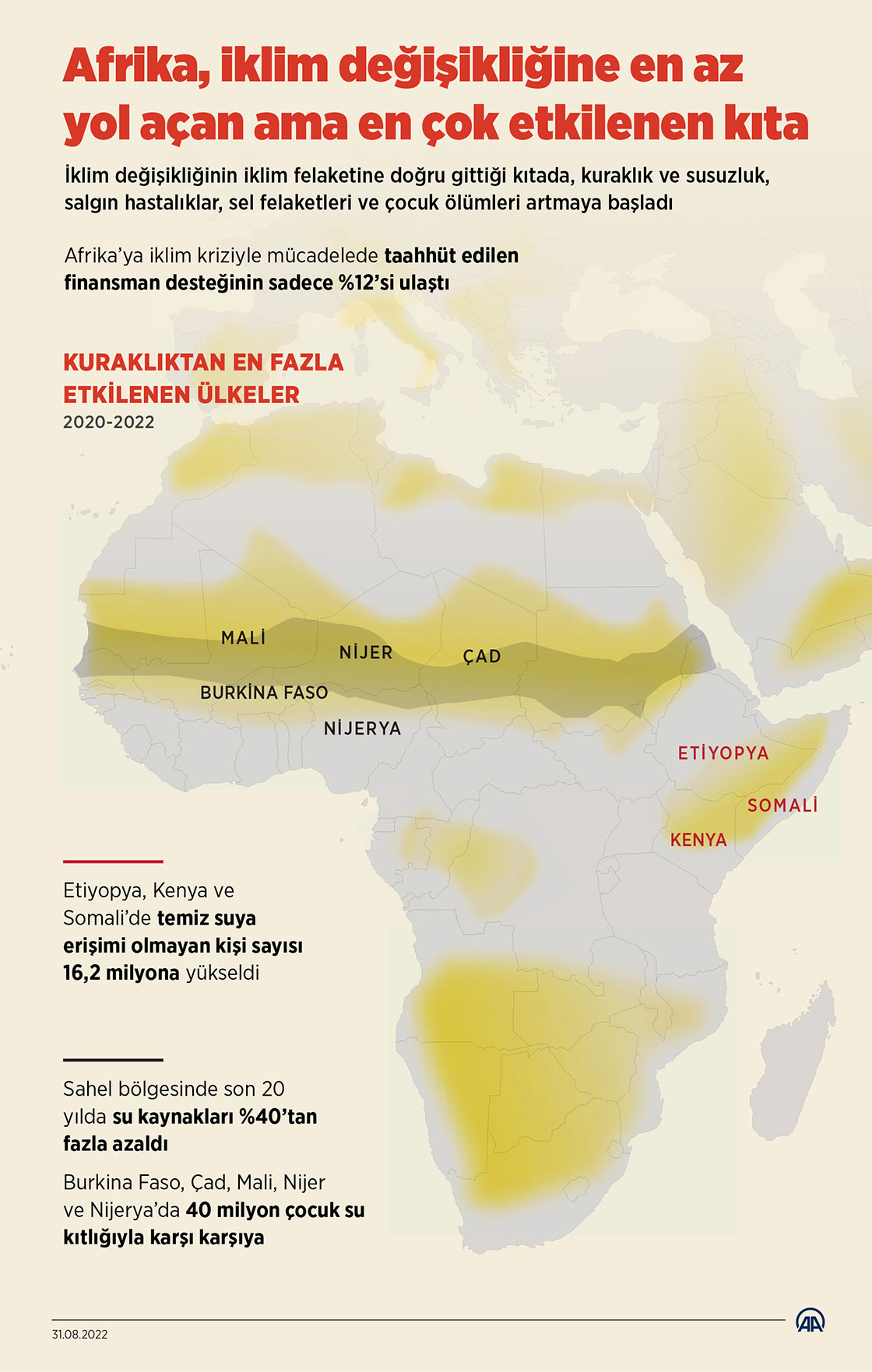 İklim değişikliğinin iklim felaketine doğru gittiği kıtada, kuraklık ve susuzluk, salgın hastalıklar, sel felaketleri ve çocuk ölümleri artmaya başladı. (Grafik: Mahmut Resul Karaca/AA)