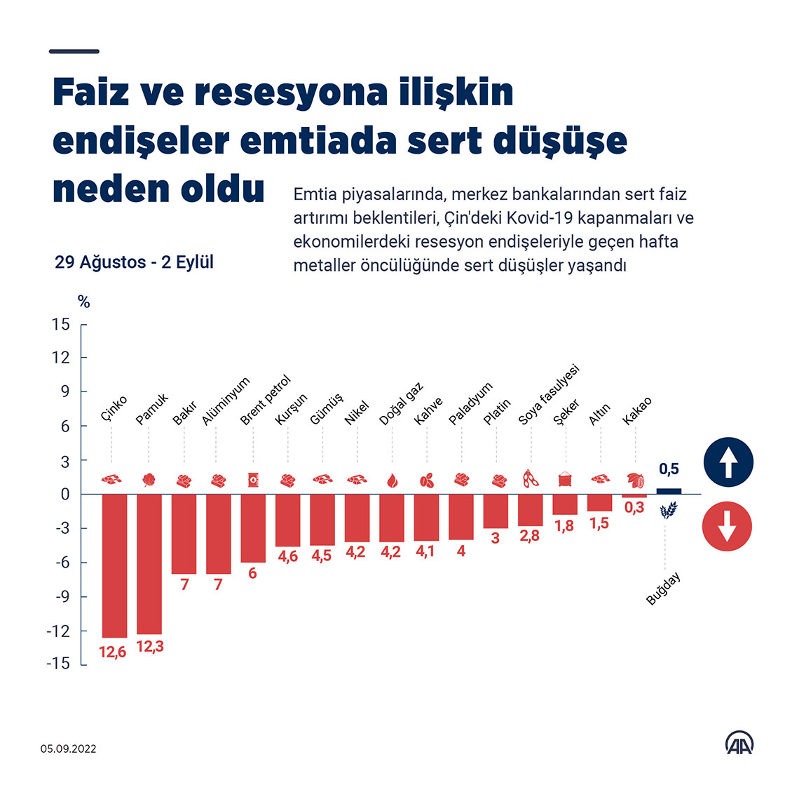 Emtia piyasalarında, dünyanın önde gelen merkez bankalarından sert faiz artırımı beklentileri, Çin'deki Kovid-19 kapanmaları ve ekonomilerde resesyon endişeleriyle geçen hafta metaller öncülüğünde sert düşüşler hakim oldu. (Grafik: Kemal Delikmen/AA)05 Eylül 2022•Güncelleme: 05 Eylül 2022