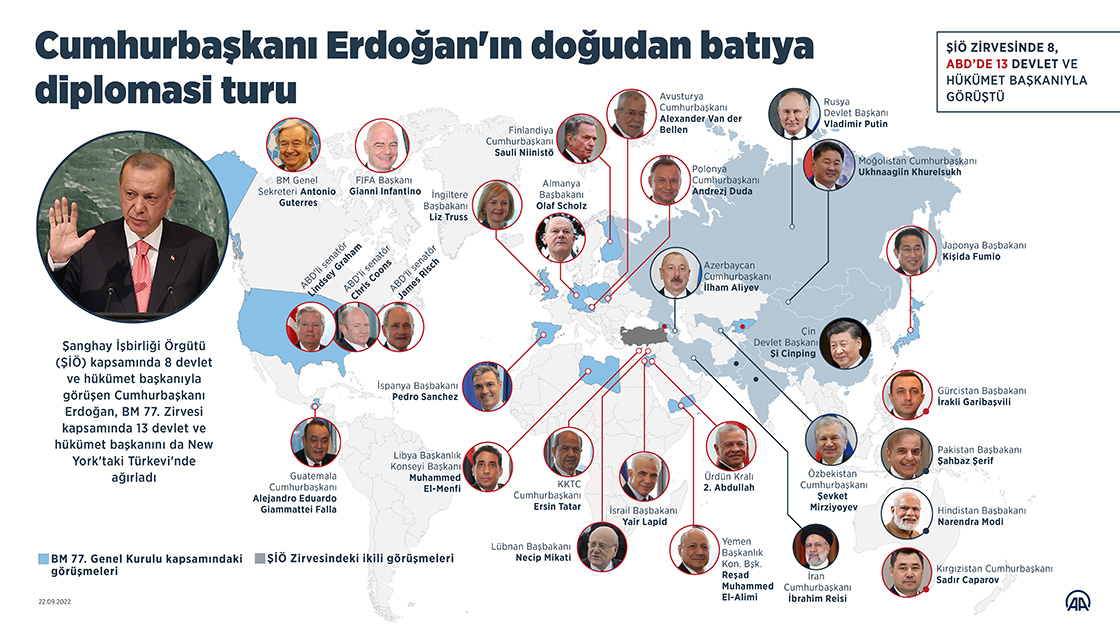 Şanghay İşbirliği Örgütü (ŞİÖ) kapsamında 8 devlet ve hükümet başkanıyla görüşen Cumhurbaşkanı Erdoğan, BM 77. Zirvesi kapsamında 13 devlet ve hükümet başkanını da New York'taki Türkevi'nde ağırladı.