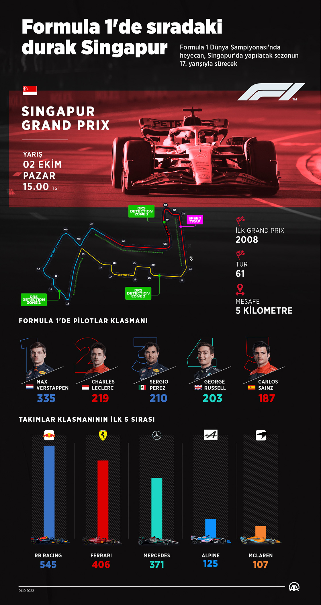 Singapur'daki 5 bin 63 metrelik Marina Bay Pisti'nde, 61 tur üzerinden yapılacak yarışın sıralama turları yarın TSİ 16.00'da başlayacak. Yarış ise 2 Ekim Pazar günü TSİ 15.00'te gerçekleştirilecek. (Grafik: Kemal Delikmen/AA)
