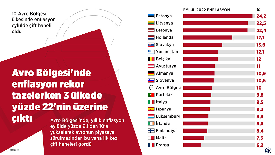 Avro Bölgesi'nde, yıllık enflasyon eylülde yüzde 9,1’den 10’a yükselerek avronun piyasaya sürülmesinden bu yana ilk kez çift haneleri gördü. (Grafik: Yasin Demirci/AA)