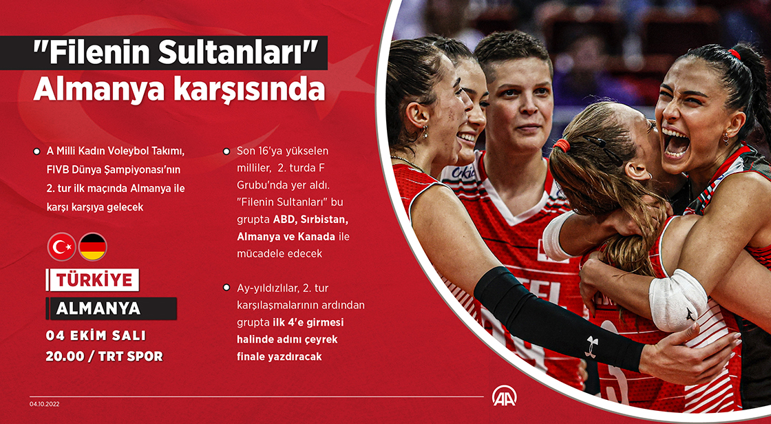 A Milli Kadın Voleybol Takımı, FIVB Dünya Şampiyonası'nın 2. tur ilk maçında Almanya ile karşı karşıya gelecek. B Grubu'nun lideri olarak son 16'ya yükselen milliler, 2. turda F Grubu'nda yer aldı.(Grafik: Kemal Delikmen/AA)