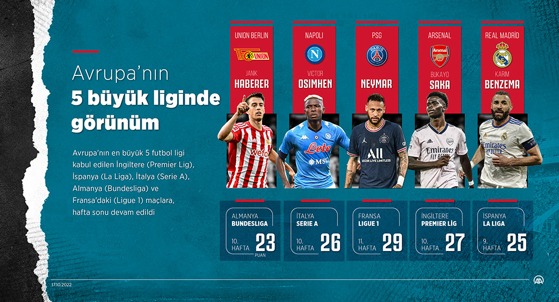 Avrupa'nın en büyük 5 futbol ligi kabul edilen İngiltere (Premier Lig), İspanya (La Liga), İtalya (Serie A), Almanya (Bundesliga) ve Fransa'daki (Ligue 1) maçlara, hafta sonu devam edildi. (Grafik: Kemal Delikmen/AA)