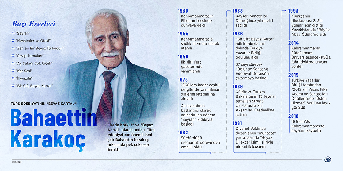 Türk edebiyatında "Dede Korkut", "Beyaz Kartal" ve "Türk Şiirinin Türkmen Dervişi" olarak anılan şair ve yazar Bahaettin Karakoç, vefatının dördüncü yılında anılıyor. (Grafik: Muhammed Ali Yiğit/AA)