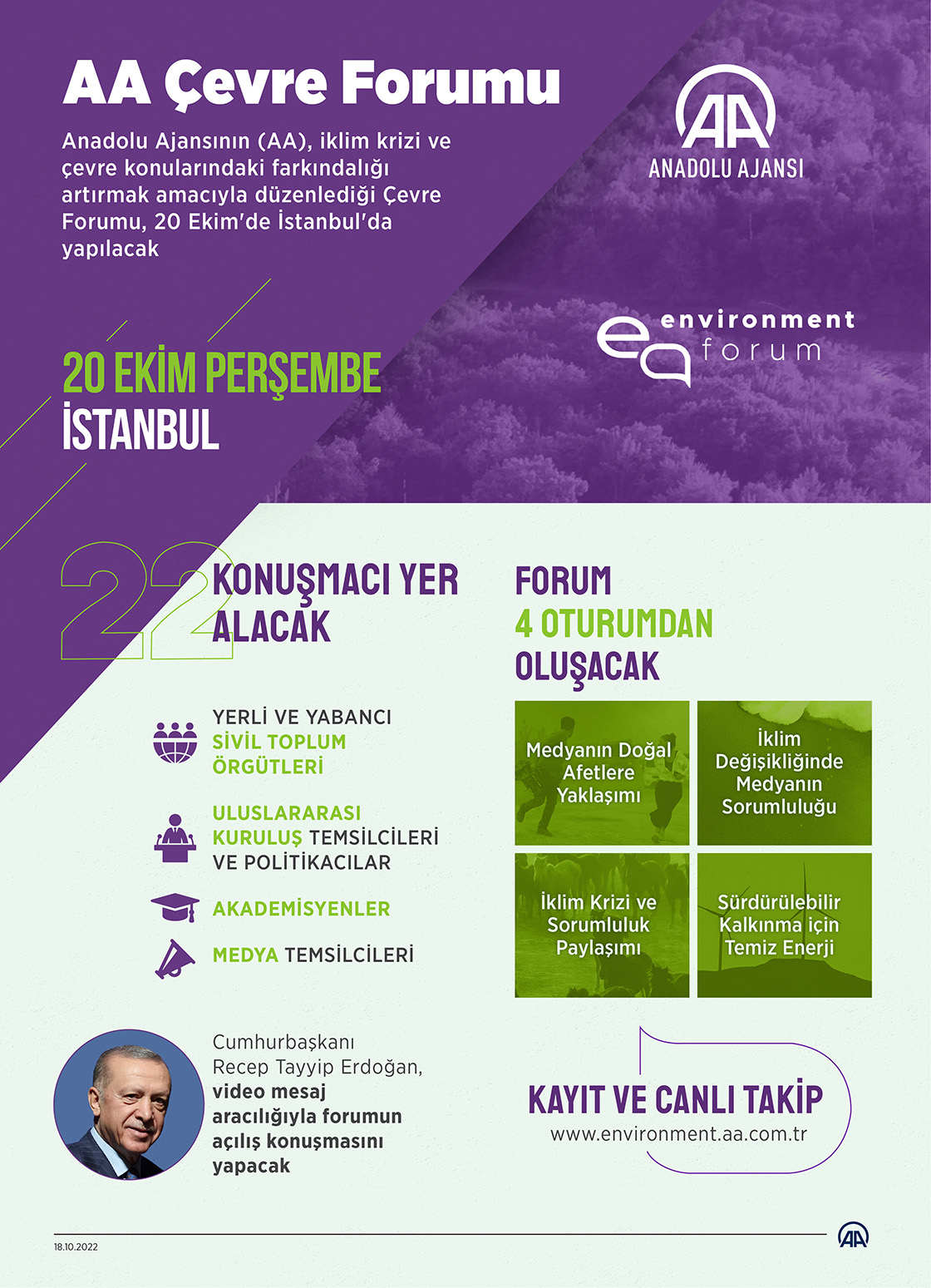 Anadolu Ajansının (AA), iklim krizi ve çevre konularındaki farkındalığı artırmak amacıyla düzenlediği Çevre Forumu, "Çevre ve iklim krizlerinin anlatısını yeniden şekillendirmek" ana temasıyla 20 Ekim Perşembe günü İstanbul'da yapılacak.18 Ekim 2022•Güncelleme: 18 Ekim 2022