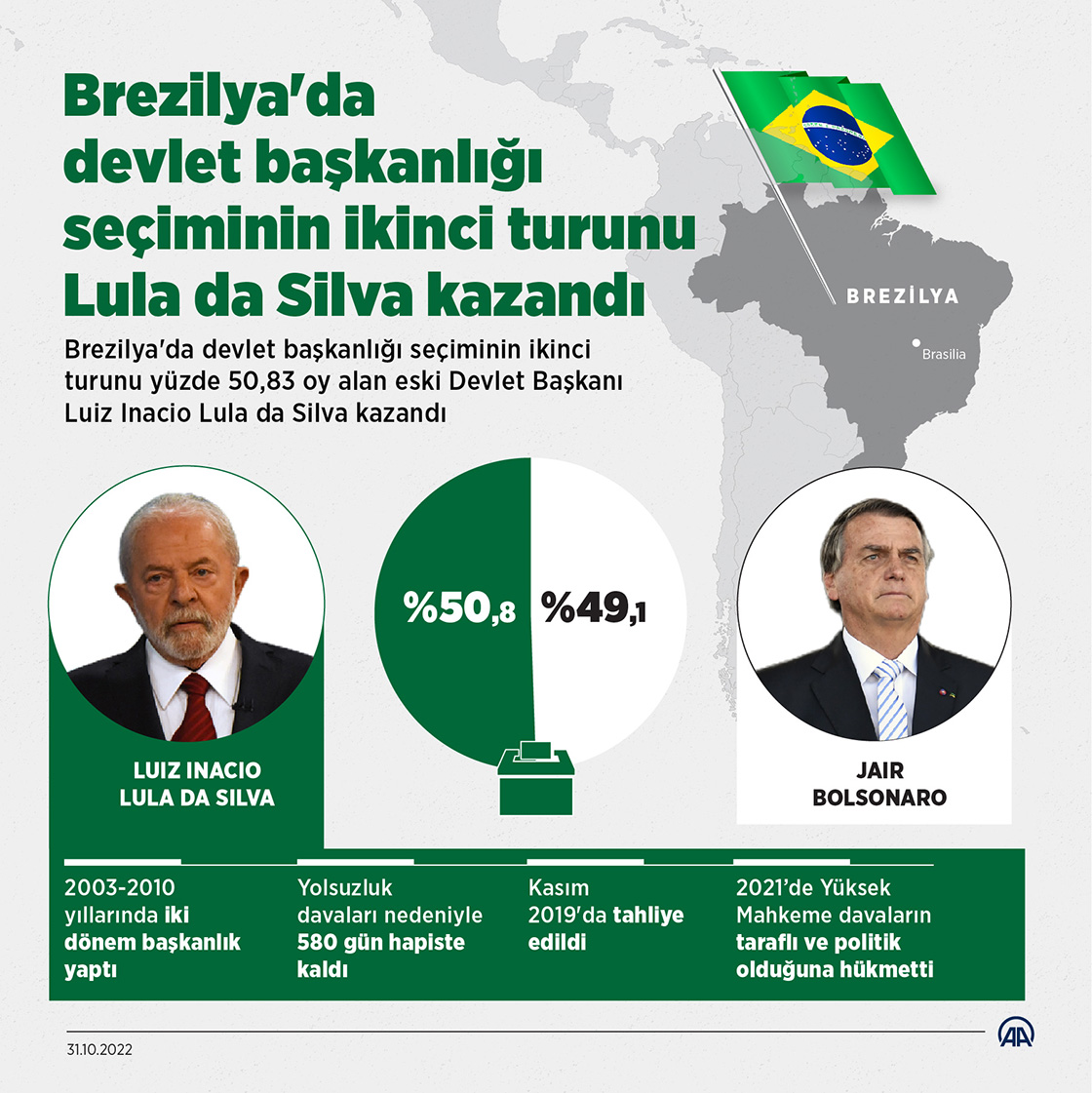 Brezilya'da devlet başkanlığı seçiminin ikinci turunu yüzde 50,83 oy alan solcu eski Devlet Başkanı Luiz Inacio Lula da Silva kazandı. (Grafik: Mahmut Resul Karaca/AA)
