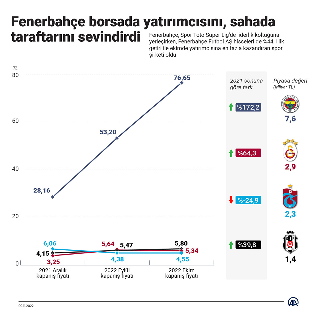 Fenerbahçe, Spor Toto Süper Lig’de liderlik koltuğuna yerleşirken, Fenerbahçe Futbol AŞ hisseleri de yüzde 44,1'lik getiri ile ekimde yatırımcısına en fazla kazandıran spor şirketi oldu. (Grafik: Muhammed Ali Yiğit/AA)