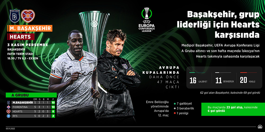 Medipol Başakşehir, UEFA Avrupa Konferans Ligi A Grubu altıncı ve son hafta maçında İskoçya'nın Hearts takımıyla sahasında karşılaşacak.(Grafik: Kemal Delikmen/AA)