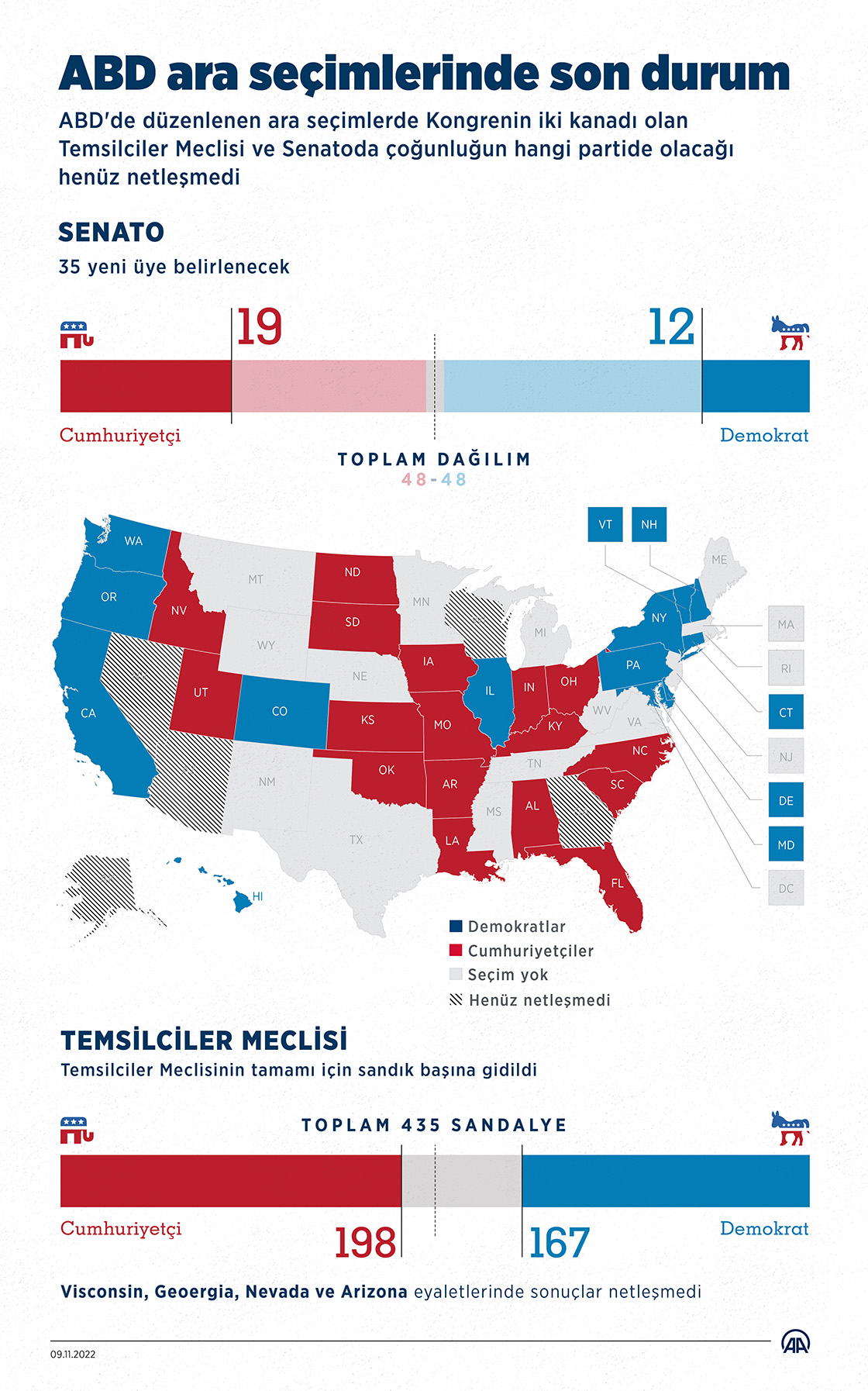 ABD'de düzenlenen ara seçimlerde Kongrenin iki kanadı olan Temsilciler Meclisi ve Senatoda çoğunluğun hangi partide olacağı henüz netleşmedi. (Grafik: Yasin Demirci/AA)