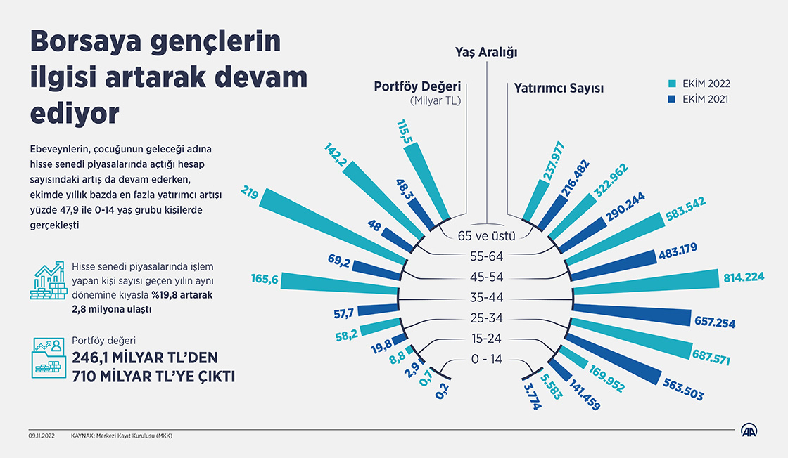 Ekim ayı itibarıyla hisse senedi piyasalarında işlem yapan 15-24 yaş grubu genç yatırımcıların sayısı 170 bine dayanırken, bu kişilerin hesap büyüklükleri ise 8 milyar 786,4 milyon liraya ulaşarak bir yılda 3 katına çıktı. (Grafik: Omar Zaghloul/AA)09 Kasım 2022•Güncelleme: 09 Kasım 2022