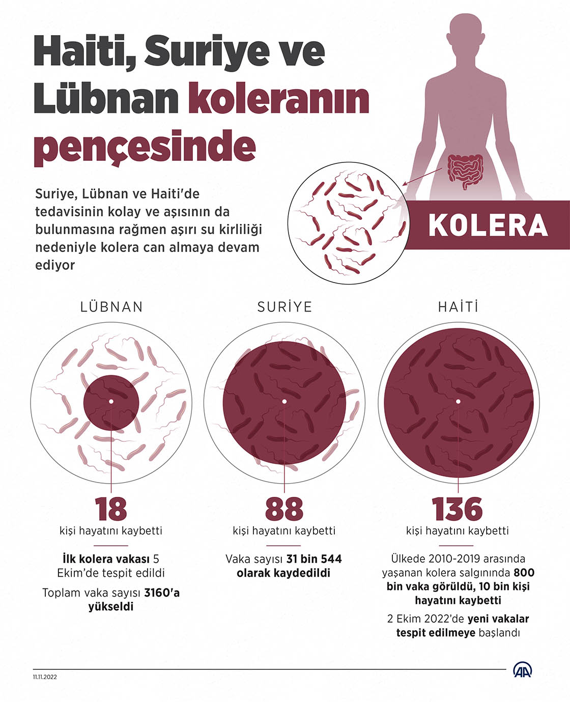 Suriye, Lübnan ve Haiti'de tedavisinin kolay ve aşısının da bulunmasına rağmen aşırı su kirliliği nedeniyle kolera can almaya devam ediyor. ( Muhammed Ali Yiğit - Anadolu Ajansı )