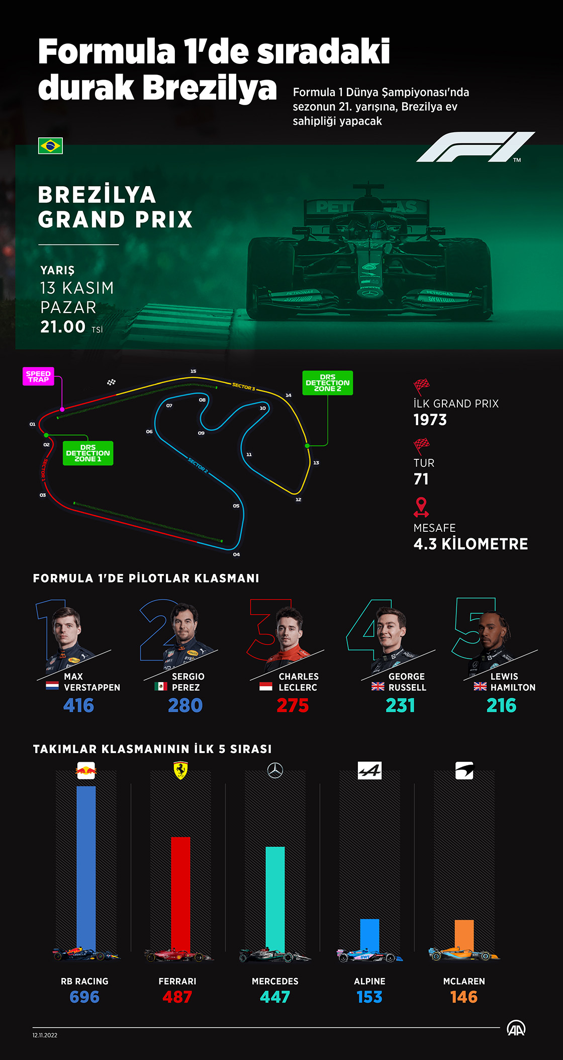 Formula 1 Dünya Şampiyonası'nda sezonun 21. yarışına, Brezilya ev sahipliği yapacak. (Grafik: Elmurod Usubaliev/AA)