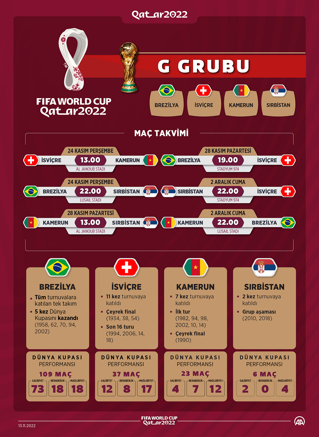 Katar'ın ev sahipliği yapacağı 2022 FIFA Dünya Kupası'nda G Grubu'nda, Brezilya, İsviçre, Kamerun ve Sırbistan mücadele edecek. (Grafik: Yılmaz Yücel/AA)
