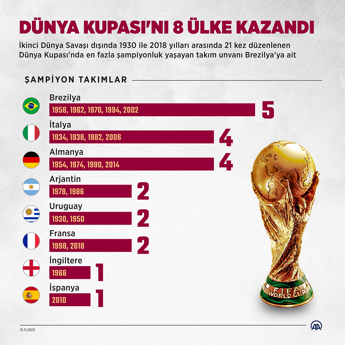 İkinci Dünya Savaşı dışında 1930 ile 2018 yılları arasında 21 kez düzenlenen Dünya Kupası'nda en fazla şampiyonluk yaşayan takım unvanı Brezilya'ya ait.(Grafik: Muhammed Ali Yiğit/AA)