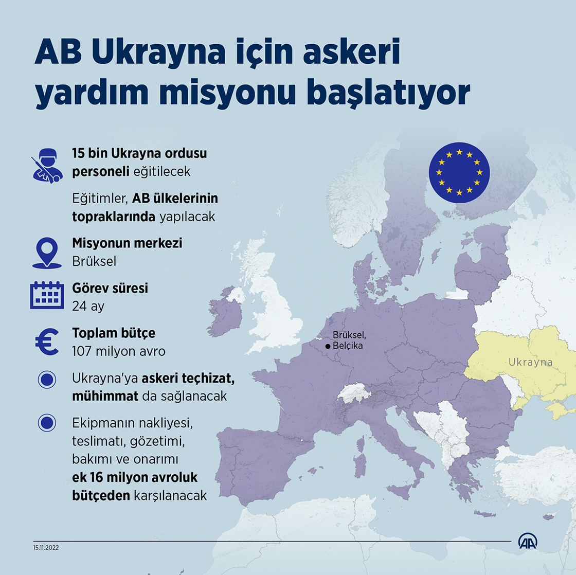 Avrupa Birliği (AB) 15 bin Ukrayna ordu personelinin eğitileceği askeri misyonunun (EUMAM Ukrayna) başlatıldığını duyurdu.