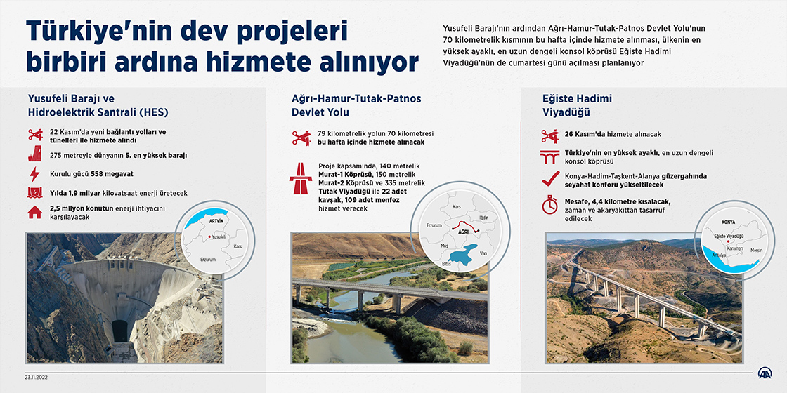 Türkiye'nin çeşitli illerinde dev projeler birbiri ardına hizmete açılıyor. Yusufeli Barajı'nın su tutma töreninin ardından Ağrı-Hamur-Tutak-Patnos Devlet Yolu'nun 70 kilometrelik kısmının bu hafta içinde hizmete alınması, ülkenin en yüksek ayaklı, en uzun dengeli konsol köprüsü Eğiste Hadimi Viyadüğü'nün de cumartesi günü açılması planlanıyor. (Grafik: Mahmut Resul Karaca/AA)23 Kasım 2022•Güncelleme: 23 Kasım 2022