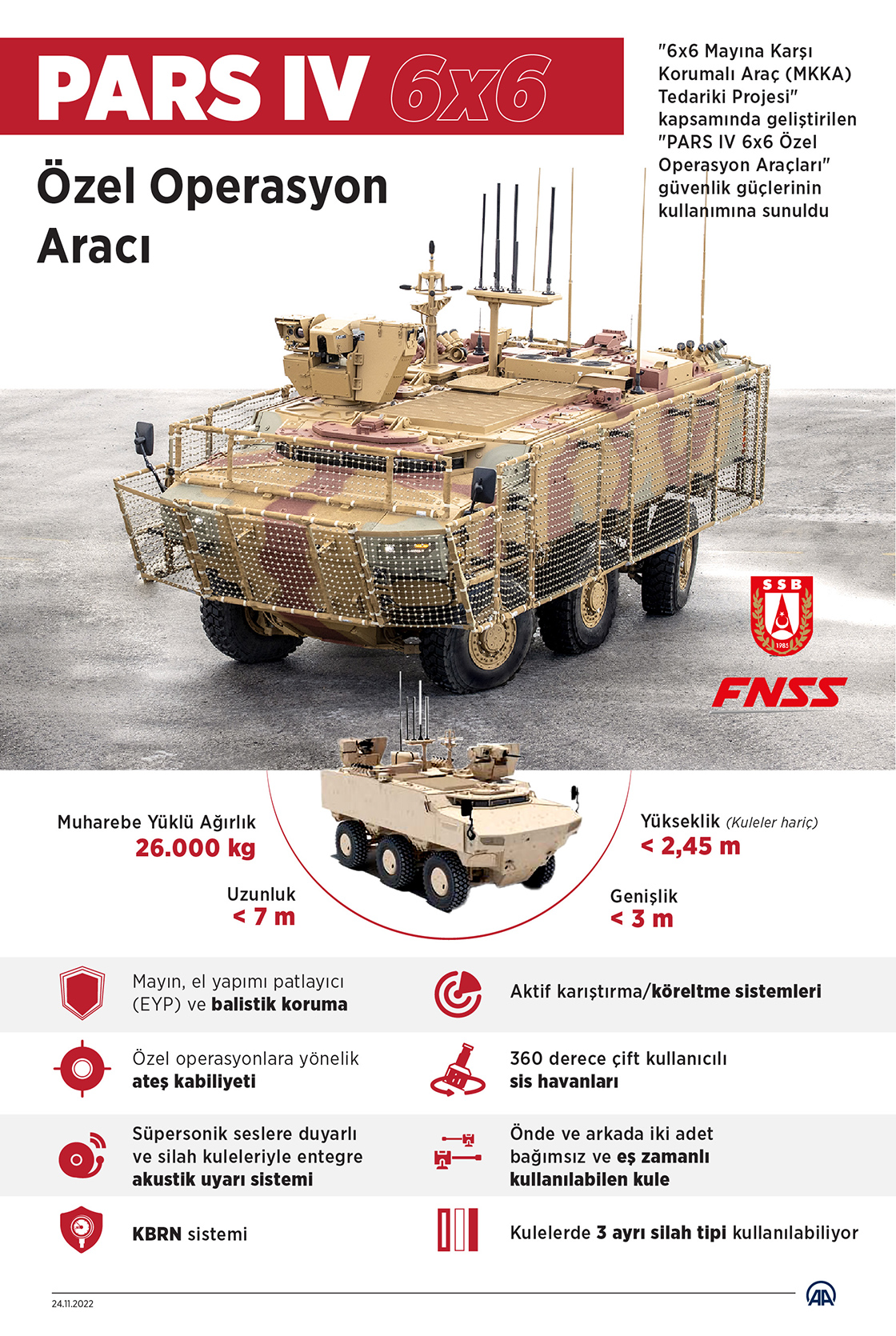 "6x6 Mayına Karşı Korumalı Araç (MKKA) Tedariki Projesi" kapsamında geliştirilen "PARS IV 6x6 Özel Operasyon Araçları" güvenlik güçlerinin kullanımına sunuldu. (Grafik: Mahmut Resul Karaca/AA