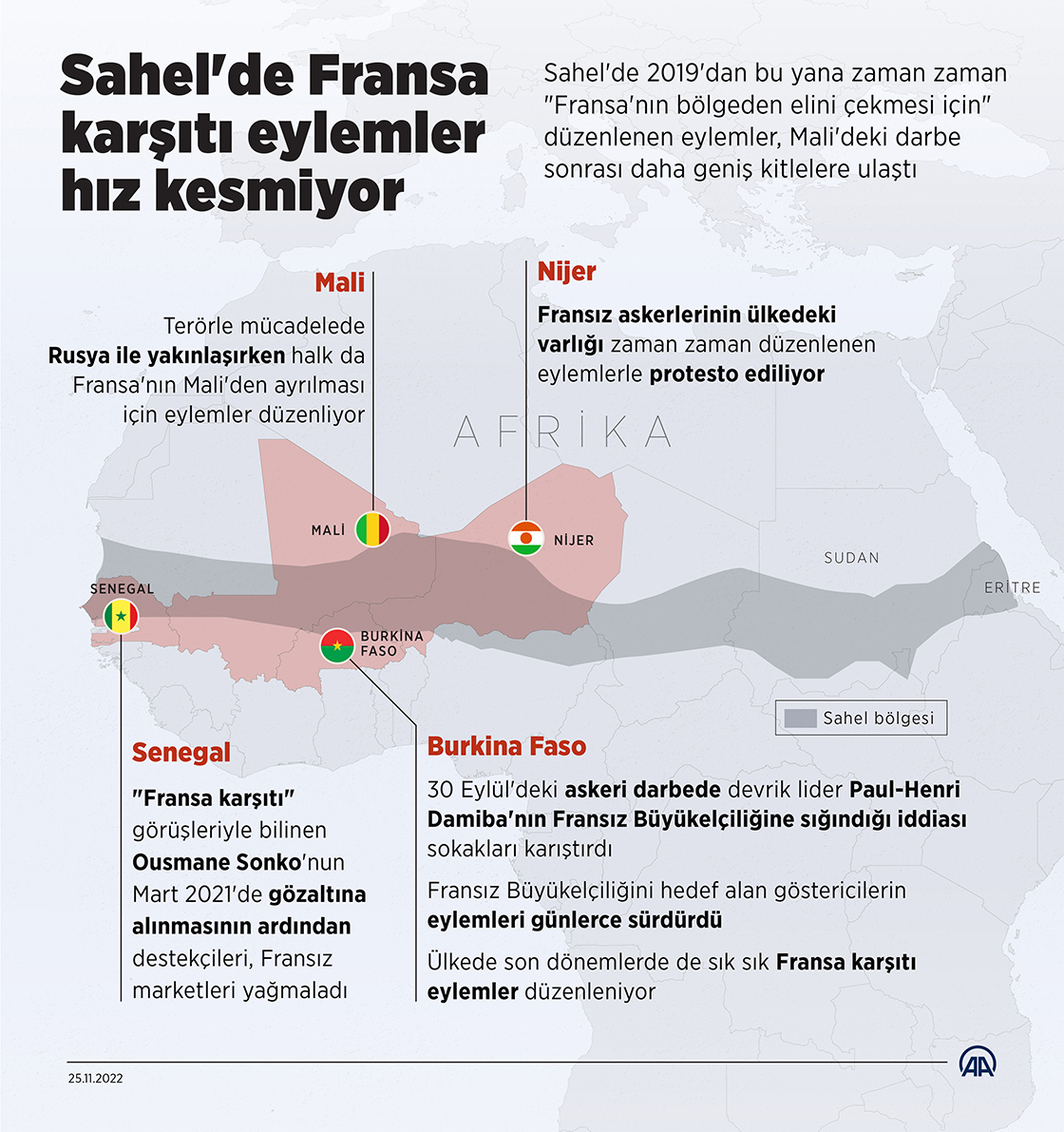 Eski Fransız sömürge ülkeleri Nijer, Burkina Faso ve Mali'de Fransa karşıtlığı güçlenirken bu minvalde düzenlenen sokak gösterileri de hız kesmeden devam ediyor. ( Elmurod Usubaliev - Anadolu Ajansı )