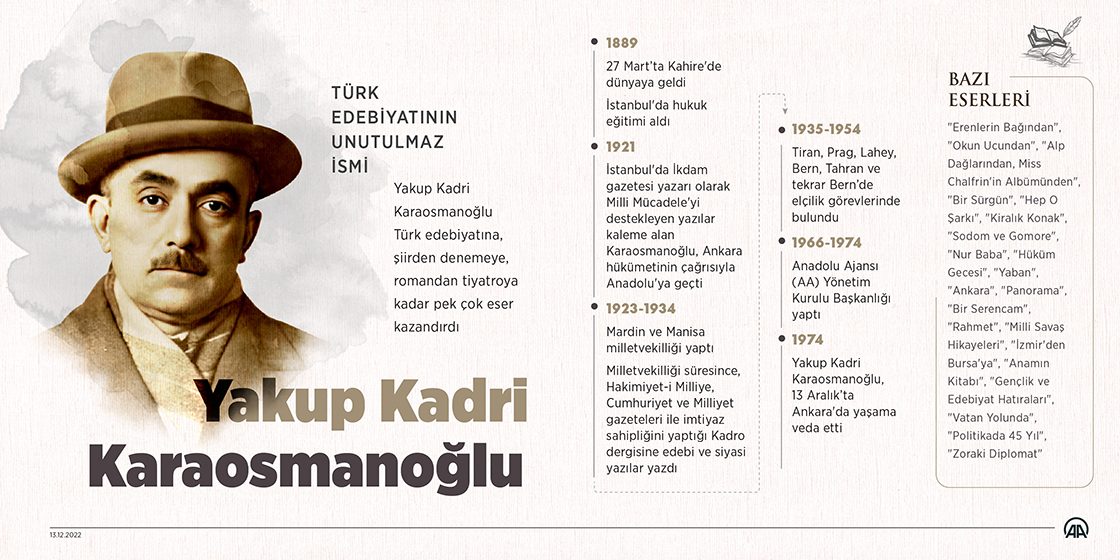 Türk edebiyatına, şiirden denemeye, romandan tiyatroya kadar pek çok bırakan, Anadolu Ajansı Yönetim Kurulu Başkanlığı görevinde de bulunan Yakup Kadri Karaosmanoğlu, eserlerinde tarihi olayları ve sosyal değişimleri ele aldı.13 Aralık 2022•Güncelleme: 13 Aralık 2022