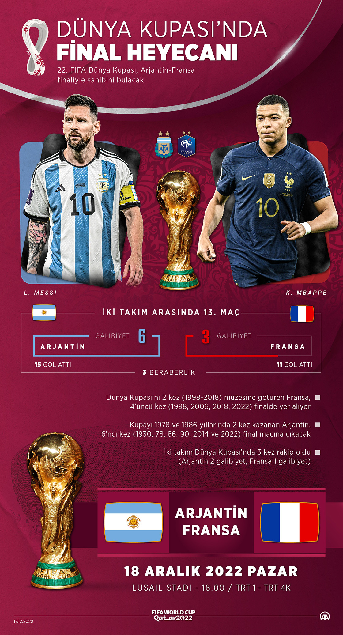 Katar'da düzenlenen 2022 FIFA Dünya Kupası'nın finalinde Arjantin ile Fransa karşılaşacak. (Grafik: Kemal Delikmen/AA)