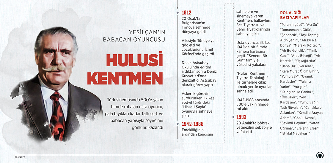 Türk sinemasında 500'e yakın filmde rol alan usta oyuncu, pala bıyıkları kadar tatlı sert ve babacan yapısıyla seyircinin gönlünü kazandı. (Grafik: Kemal Delikmen/AA)