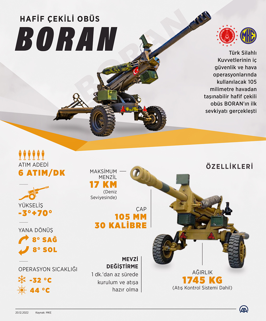 Türk Silahlı Kuvvetlerinin iç güvenlik ve hava operasyonlarında kullanılacak 105 milimetre havadan taşınabilir hafif çekili obüs BORAN'ın ilk sevkiyatı gerçekleşti. (Grafik: Muhammed Ali Yiğit/AA)