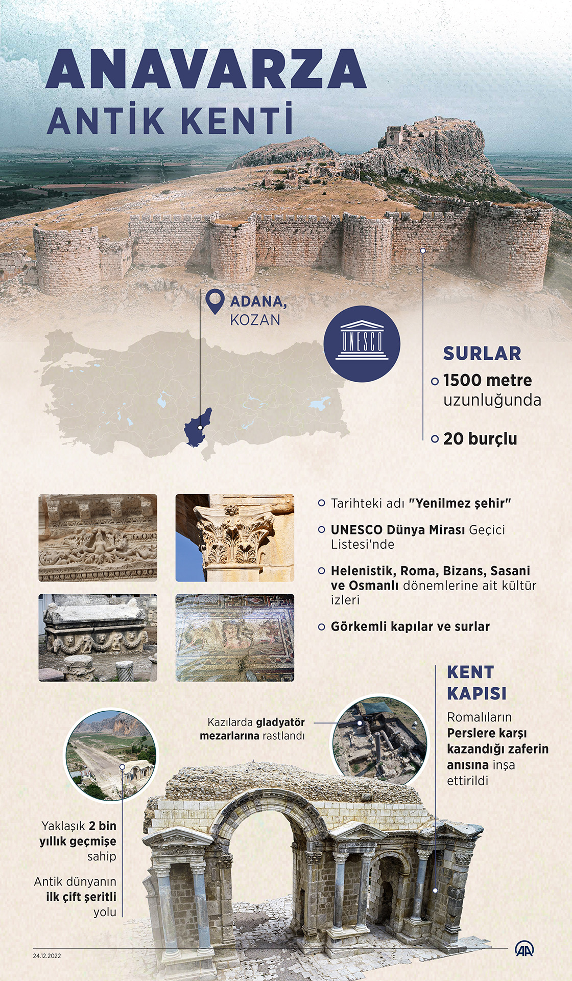 Adana'nın Kozan ilçesindeki Anavarza Antik Kenti'nde, üzerinde Grekçe yazıtın yer aldığı Kilikya Generali İllus'a ait olduğu değerlendirilen hamam-saray kompleksi bulundu. (Grafik: Muhammed Ali Yiğit/AA)
