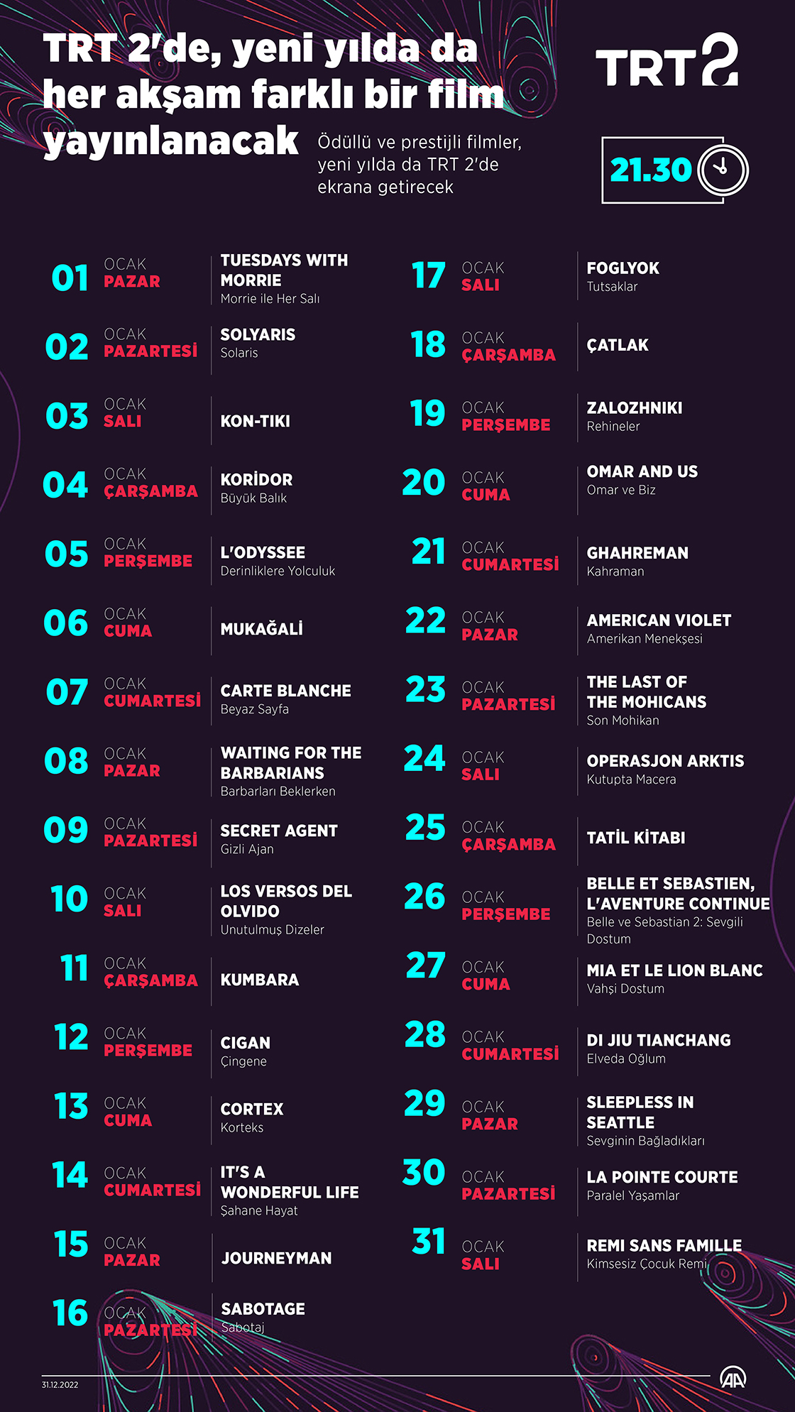 TRT 2'de, yeni yılda da her akşam farklı bir film yayınlanacak