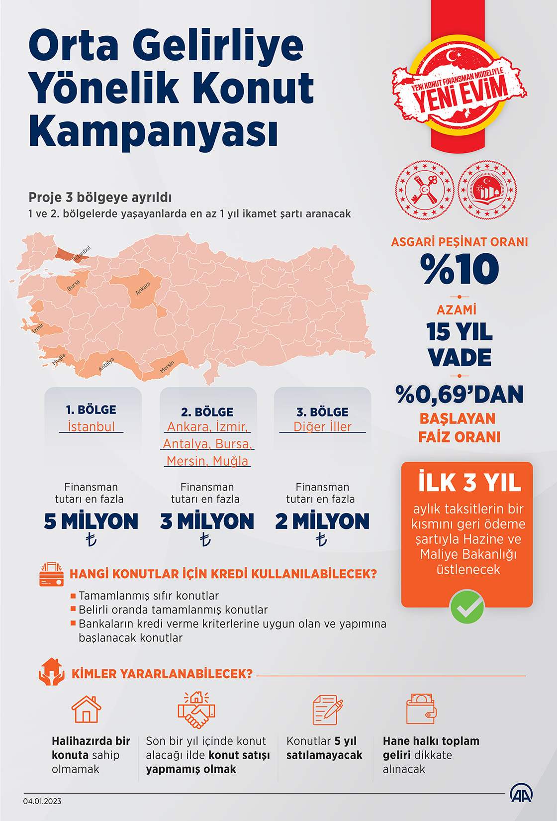 Orta gelirlilere yönelik "Yeni Evim Kampanyası"nda tüm bölgelerde asgari peşinat oranı yüzde 10 olarak belirlendi, azami 15 sene vadeyle sağlanacak finansmanlarda faiz/kar payı oranlarının yüzde 0,69'dan başlayan oranlarla uygulanacağı açıklandı. (Grafik: Omar Zaghloul/AA)04 Ocak 2023•Güncelleme: 04 Ocak 2023