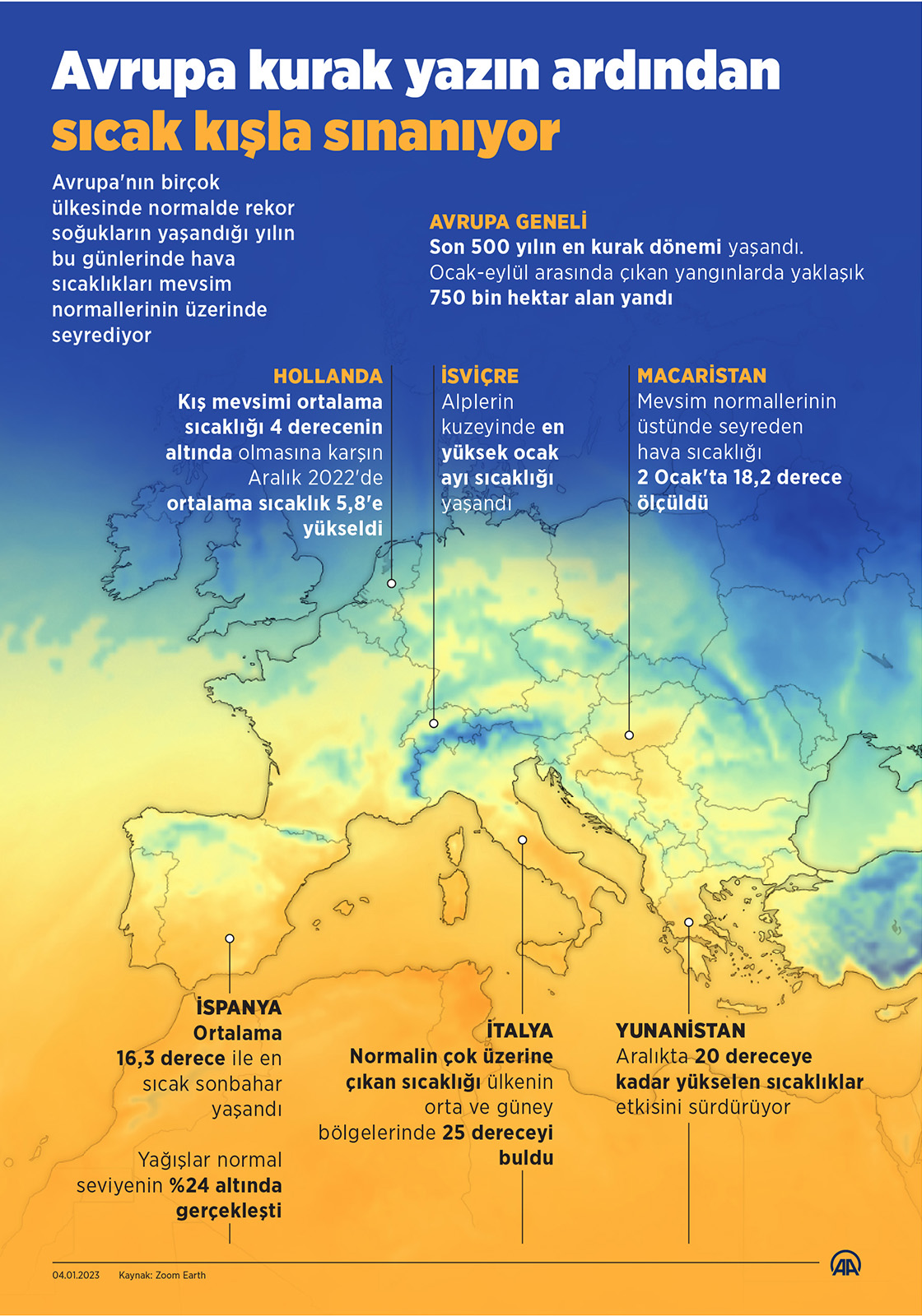 Avrupa'nın birçok ülkesinde normalde rekor soğukların yaşandığı yılın bu günlerinde hava sıcaklıkları mevsim normallerinin üzerinde seyrediyor. (Grafik: Yasin Demirci/AA)