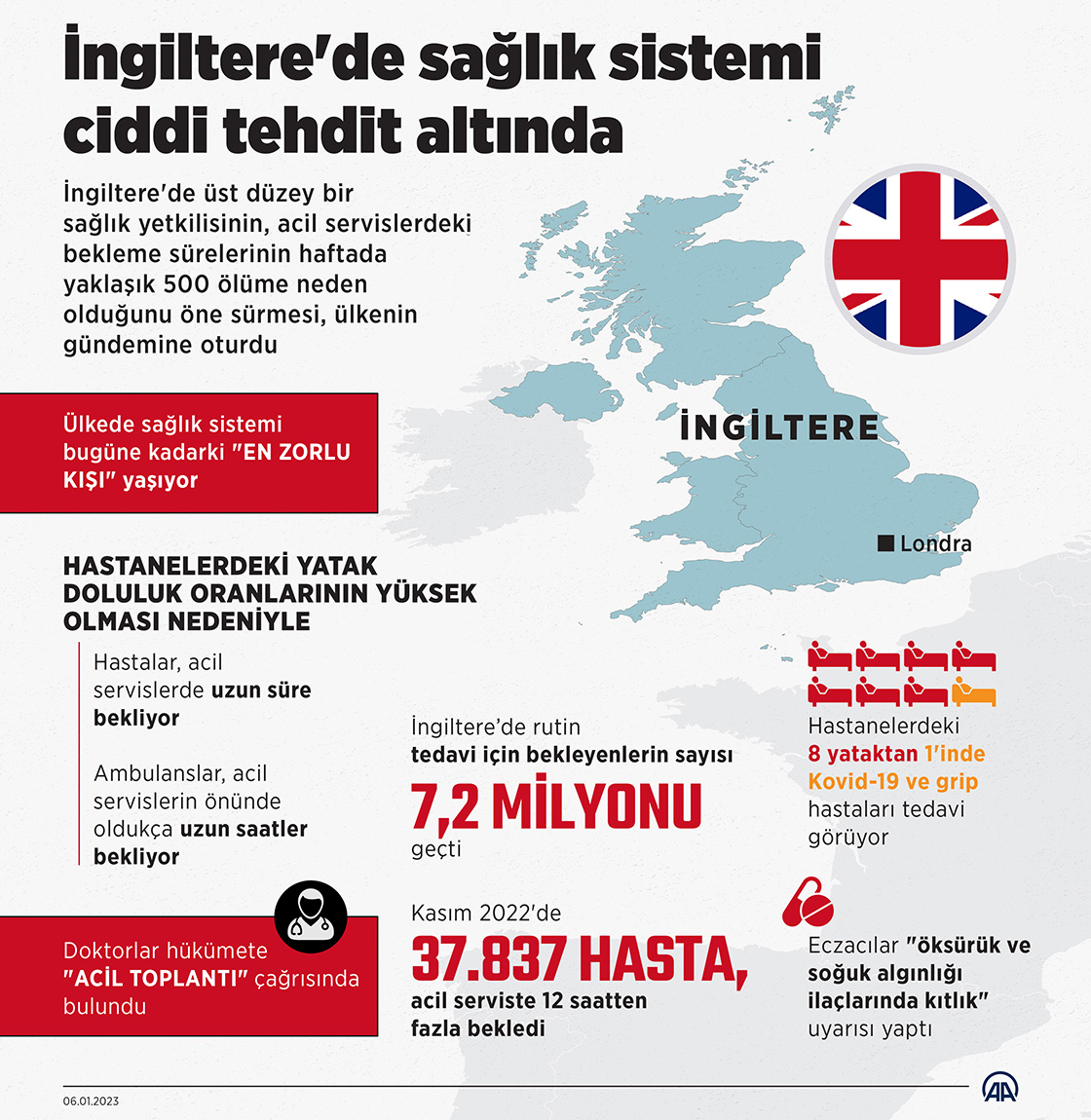 İngiltere'de hastaların ambulans bekleme süreleri ve acil servislerdeki bekleyişi rekor seviyelere ulaşırken hastanelerdeki yüksek yatak doluluk oranlarıyla sağlık sistemi bugüne kadarki "en zorlu kışı" yaşıyor. (Grafik: Yasin Demirci/AA)
