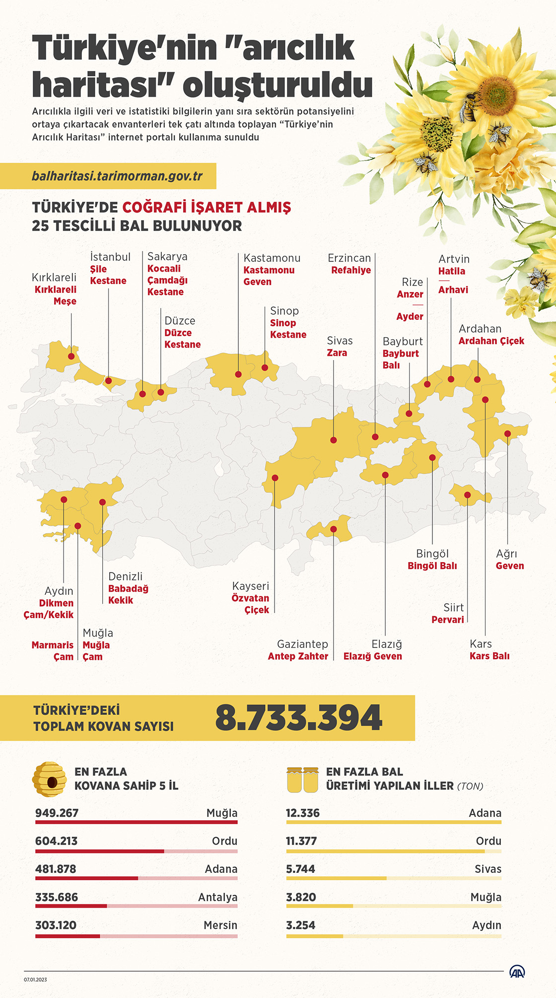 Arıcılıkla ilgili veri ve istatistiki bilgilerin yanı sıra sektörün potansiyelini ortaya çıkartacak envanterleri tek çatı altında toplayan “Türkiye’nin Arıcılık Haritası” internet portalı kullanıma sunuldu. (Grafik: Mahmut Resul Karaca/AA)