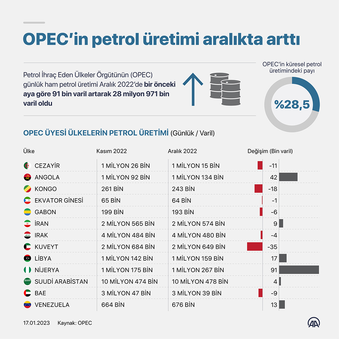 Petrol İhraç Eden Ülkeler Örgütünün (OPEC) günlük ham petrol üretimi Aralık 2022’de bir önceki aya göre 91 bin varil artarak 28 milyon 971 bin varil oldu.