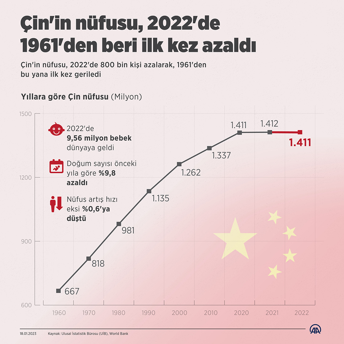 Çin'in nüfusu, 2022'de 800 bin kişi azalarak,1961'den bu yana ilk kez geriledi. (Grafik: Yasin Demirci/AA)