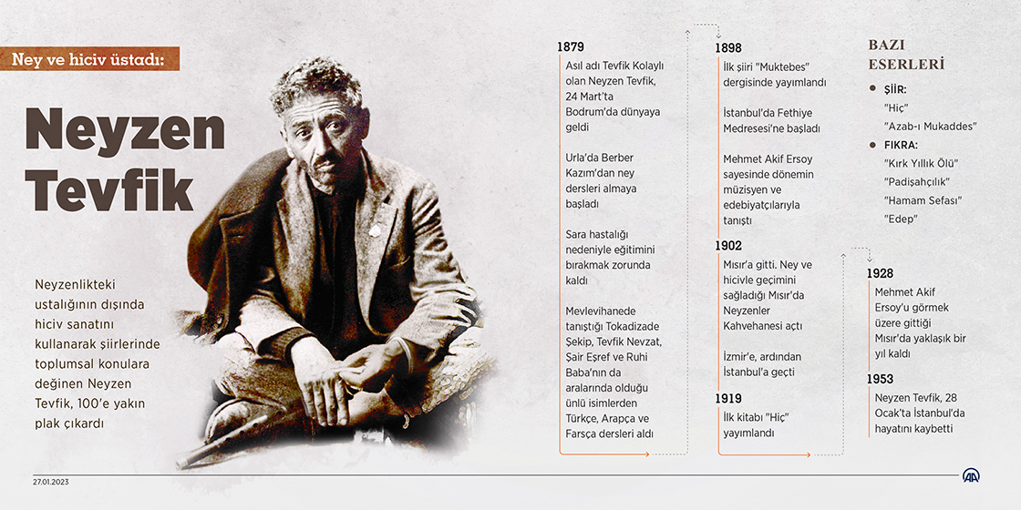 Neyzenlikteki ustalığının dışında hiciv sanatını kullanarak şiirlerinde toplumsal konulara değinen Neyzen Tevfik, 100'e yakın plak çıkardı. (Grafik: Kemal Delikmen/AA)