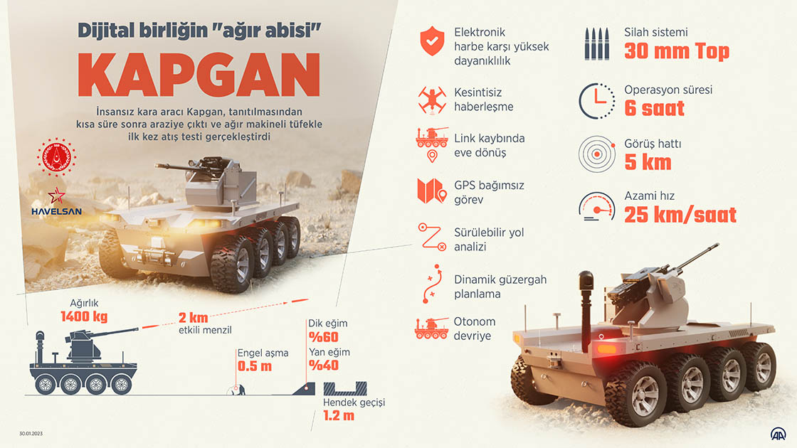 İnsansız kara aracı Kapgan, tanıtılmasından kısa süre sonra araziye çıktı ve ağır makineli tüfekle ilk kez atış testi gerçekleştirdi. (Grafik: Yasin Demirci/AA)