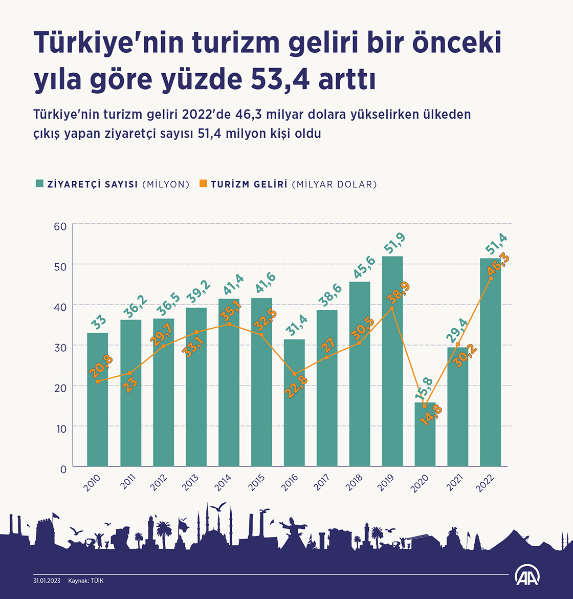 Türkiye'nin turizm geliri, 2022'de bir önceki yıla göre yüzde 53,4 artarak 46 milyar 284 milyon 907 bin dolara yükselirken ülkeden çıkış yapan ziyaretçi sayısı 51 milyon 369 bin 26 kişi oldu. (Grafik: Omar Zaghloul/AA)