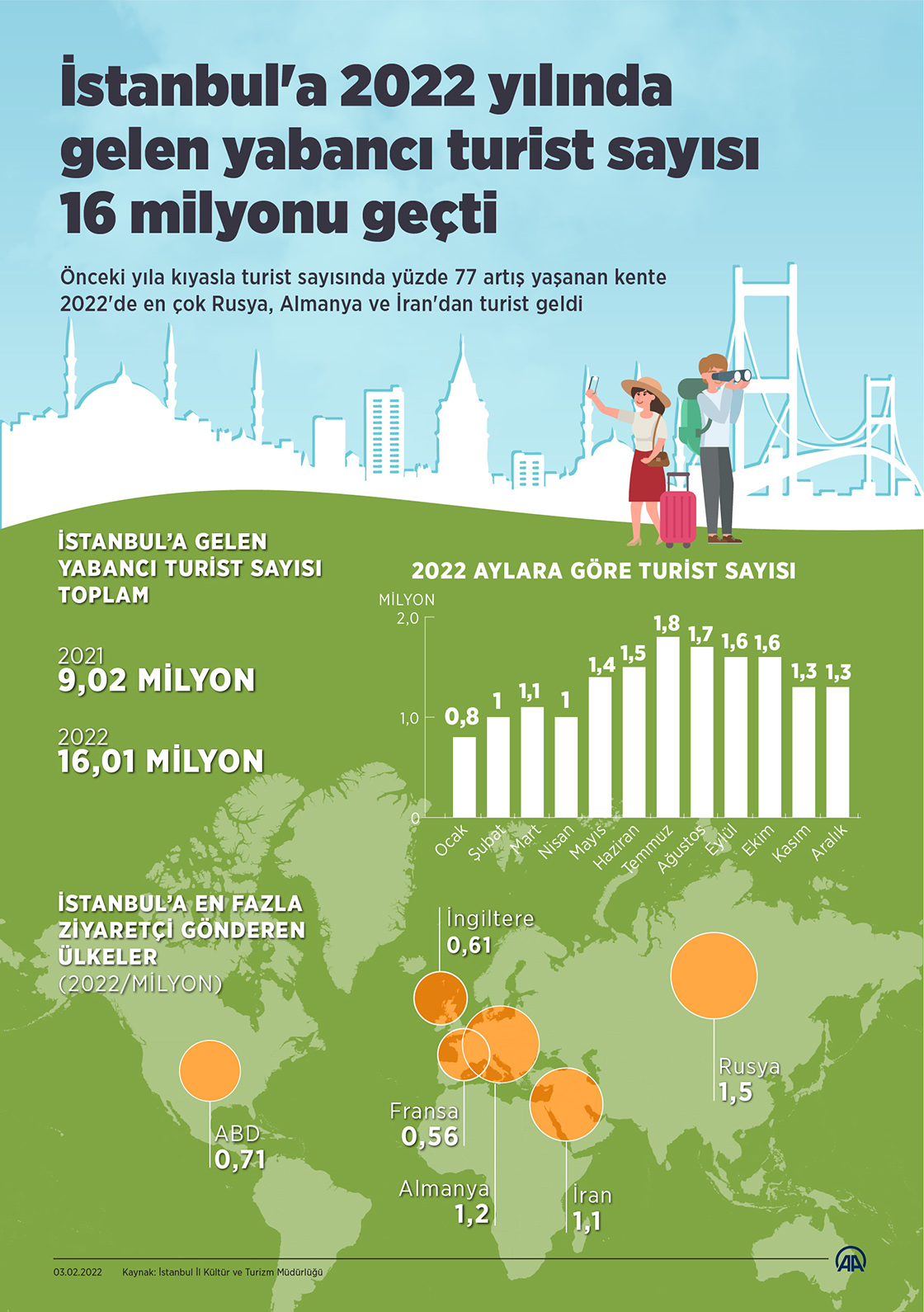 İstanbul'a 2022 yılında gelen yabancı turist sayısı 16 milyonu geçti