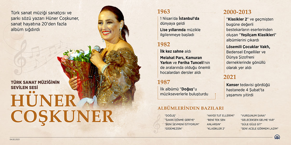 Türk Sanat Müziği sanatçısı, şarkı sözü yazarı Hüner Coşkuner sanat hayatına 20'den fazla albüm sığdırdı.