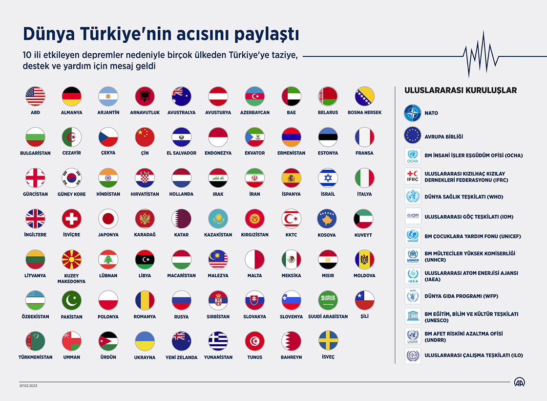 Kahramanmaraş merkezli, 10 ili etkileyen 7,7 ve 7,6 büyüklüğündeki depremler nedeniyle birçok ülkeden Türkiye'ye taziye ve destek için telefon ve mesaj geldi. (Grafik: Omar Zaghloul/AA)
