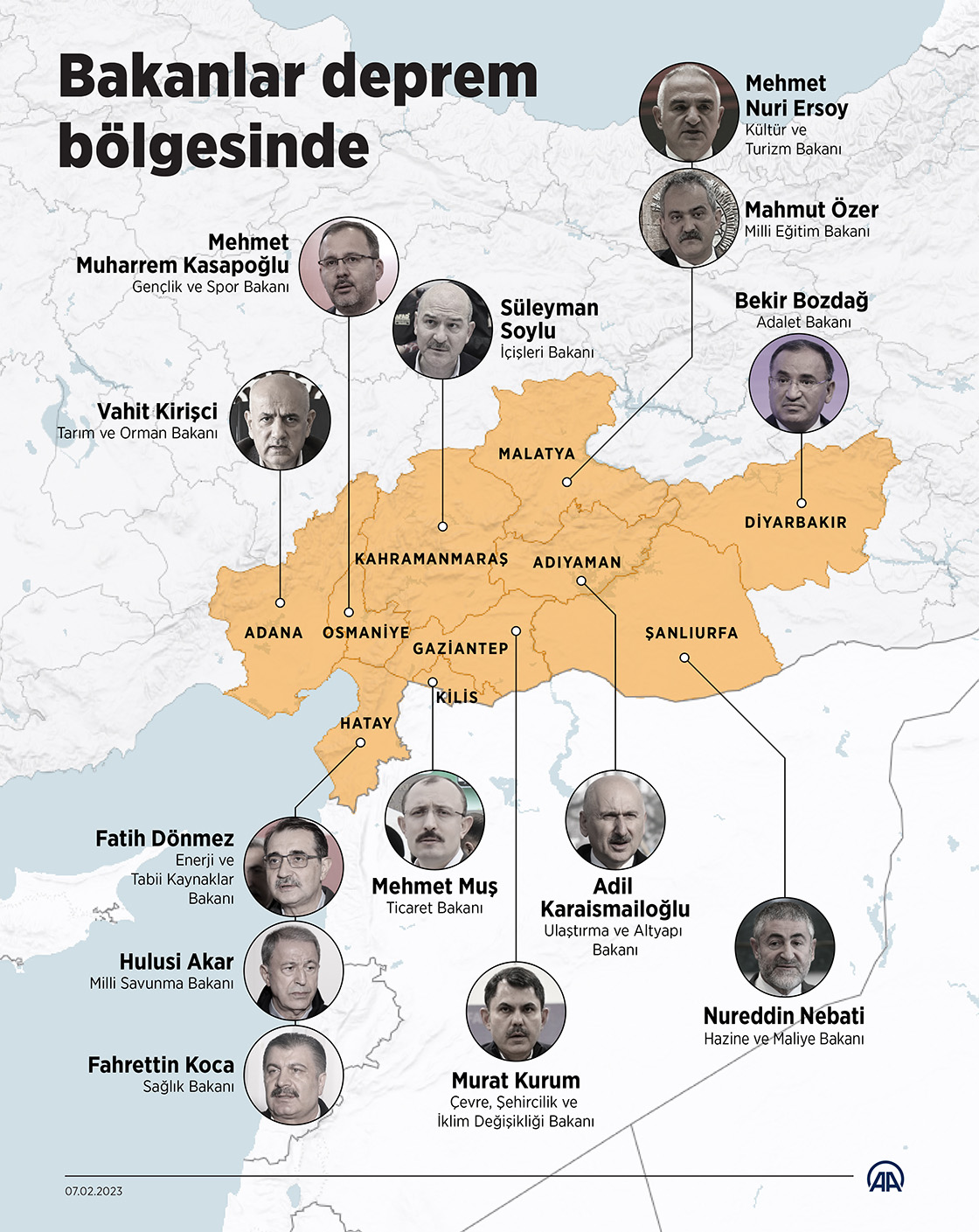 Kahramanmaraş merkezli, 10 ili etkileyen depremlerin ardından bölgeye giden bakanlar, çalışmaları yakından takip ediyor. (Grafik: Yasin Demirci/AA)