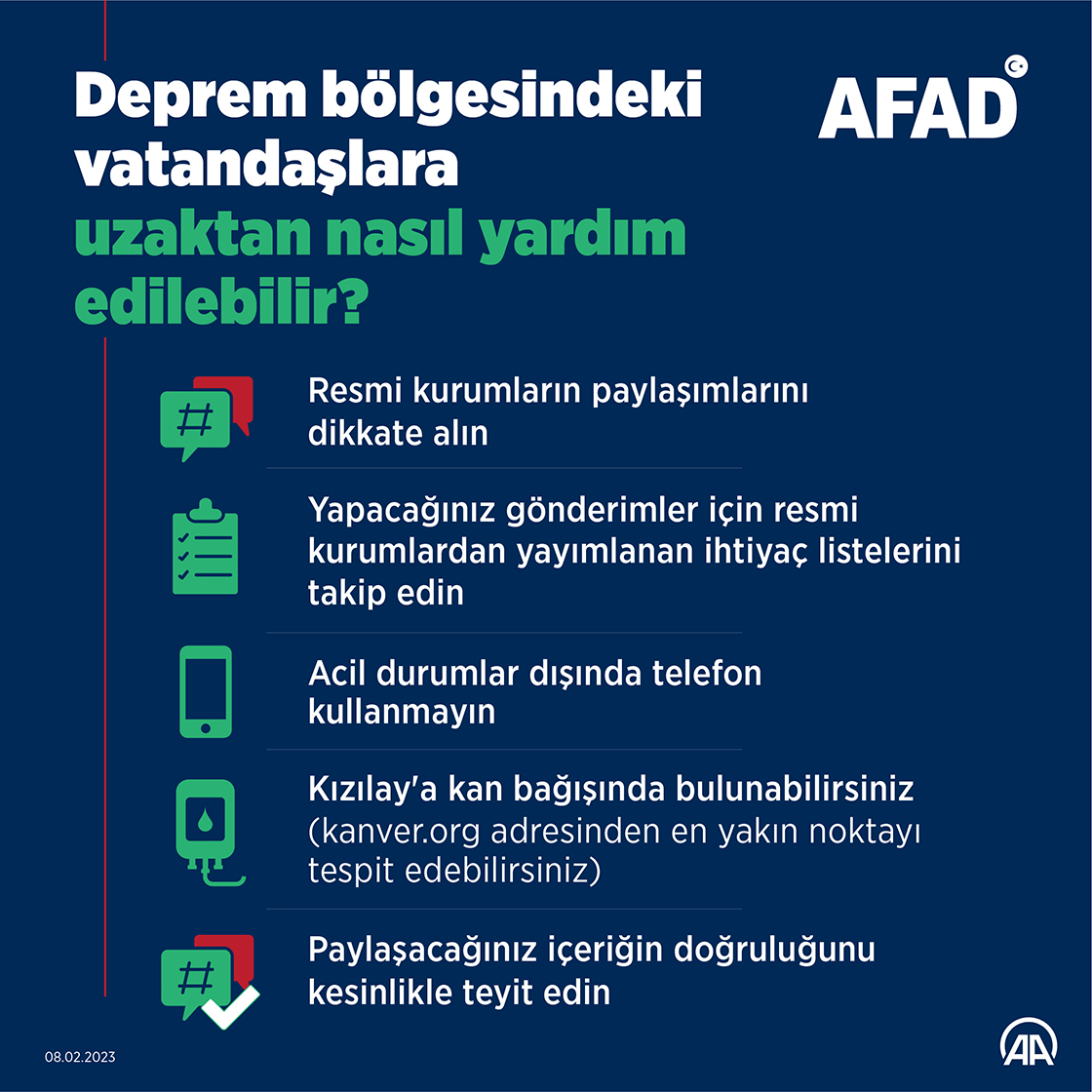 Deprem bölgesine uzaktan yardım etmek isteyenler vatandaşlar, resmi kurumları takip ederek teyit edilmiş paylaşımlara göre hareket etmeli. (Grafik: Yasin Demirci/AA)
