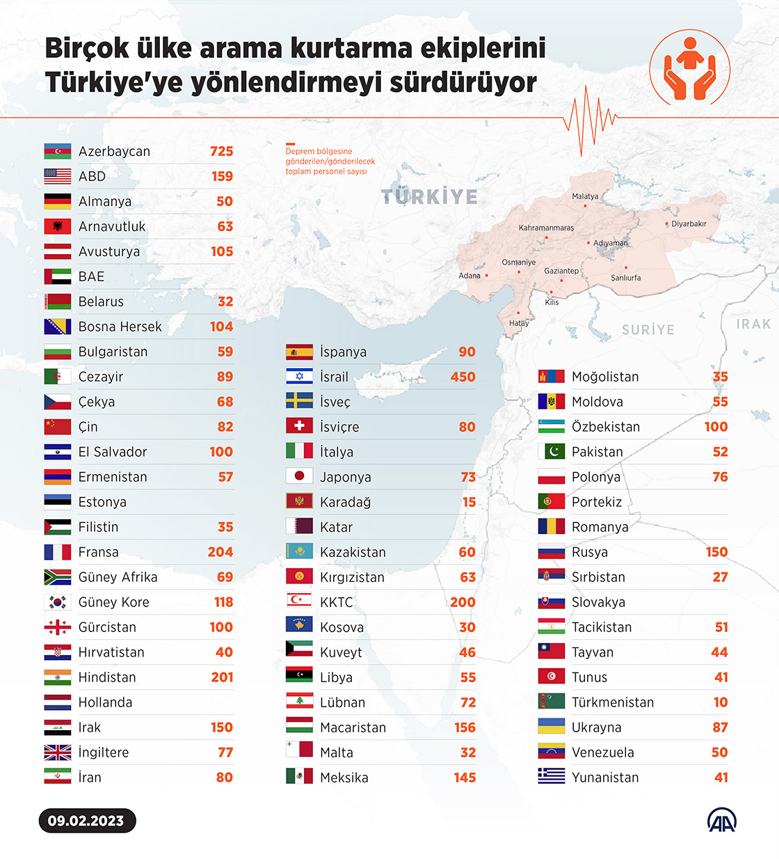 Kahramanmaraş merkezli, 10 ili etkileyen depremler nedeniyle birçok ülke Türkiye'ye arama kurtarma personeli göndermeye devam ediyor. (Grafik: Elmurod Usubaliev/AA)