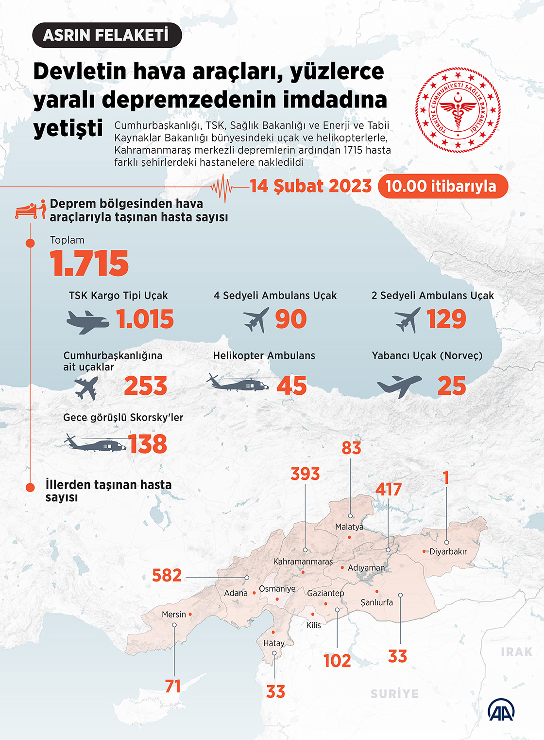 Cumhurbaşkanlığı, TSK, Sağlık Bakanlığı ve Enerji ve Tabii Kaynaklar Bakanlığı bünyesindeki uçak ve helikopterlerle, Kahramanmaraş merkezli depremlerin ardından 1715 hasta farklı şehirlerdeki hastanelere nakledildi.