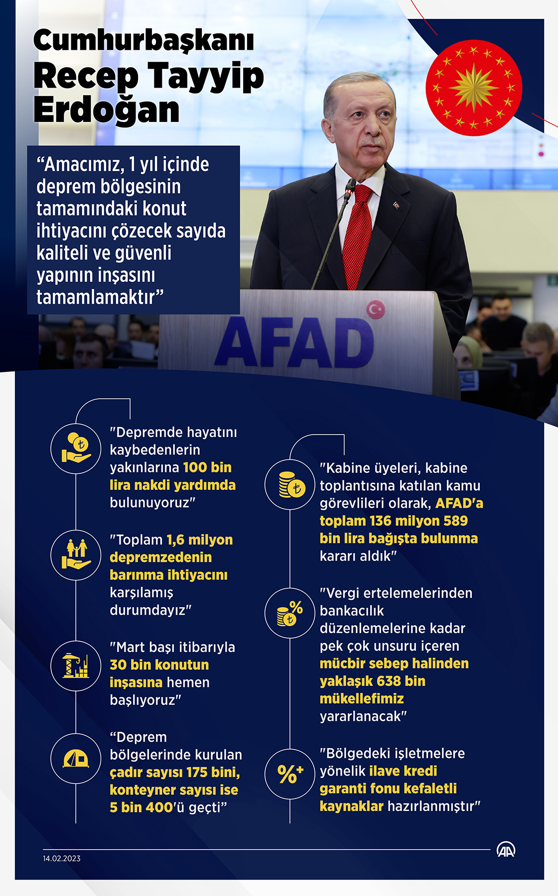 Cumhurbaşkanı Recep Tayyip Erdoğan, Kahramanmaraş merkezli depremlerin ardından koordinasyon merkezi olarak kullanılan Afet ve Acil Durum Yönetimi (AFAD) Başkanlığı Merkez Binası'nda düzenlenen Kabine Toplantısı'nın ardından millete seslendi. (Grafik: Elmurod Usubaliev/AA)14 Şubat 2023•Güncelleme: 14 Şubat 2023