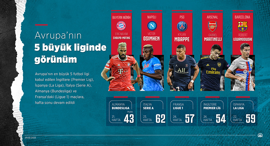 Avrupa'nın en büyük 5 futbol ligi İngiltere (Premier Lig), İspanya (La Liga), İtalya (Serie A), Almanya (Bundesliga) ve Fransa'daki (Ligue 1) maçlara, hafta sonu devam edildi. (Grafik: Kemal Delikmen/AA)