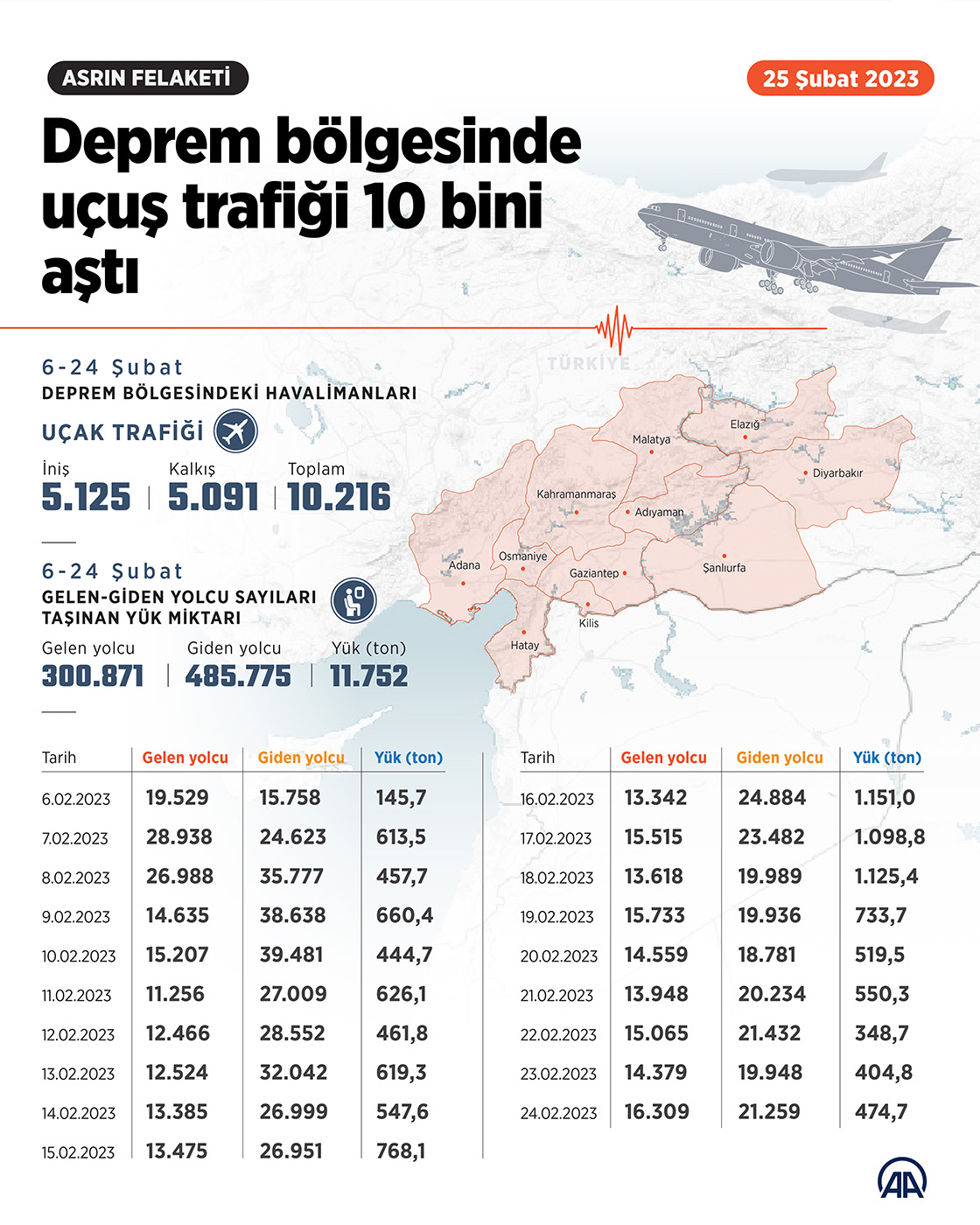Kahramanmaraş ve Hatay merkezli depremlerin etkilediği illere arama kurtarma ekipleriyle yardım malzemelerinin ulaştırılması ve bölgeden tahliyelerin gerçekleştirilmesi için yapılan uçuş sayısı 10 bini geçti. (Grafik: Muhammed Ali Yiğit/AA)