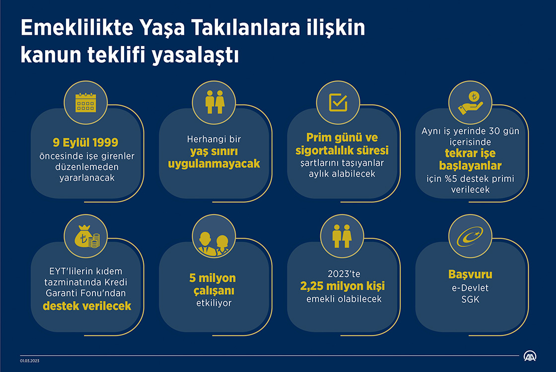 Emeklilikte Yaşa Takılanlarla (EYT) ilgili düzenlemeleri içeren Sosyal Sigortalar ve Genel Sağlık Sigortası Kanunu ile 375 sayılı Kanun Hükmünde Kararnamede Değişiklik Yapılmasına Dair Kanun Teklifi, TBMM Genel Kurulunda kabul edilerek yasalaştı. (Grafik: Muhammed Ali Yiğit/AA)01 Mart 2023•Güncelleme: 01 Mart 2023