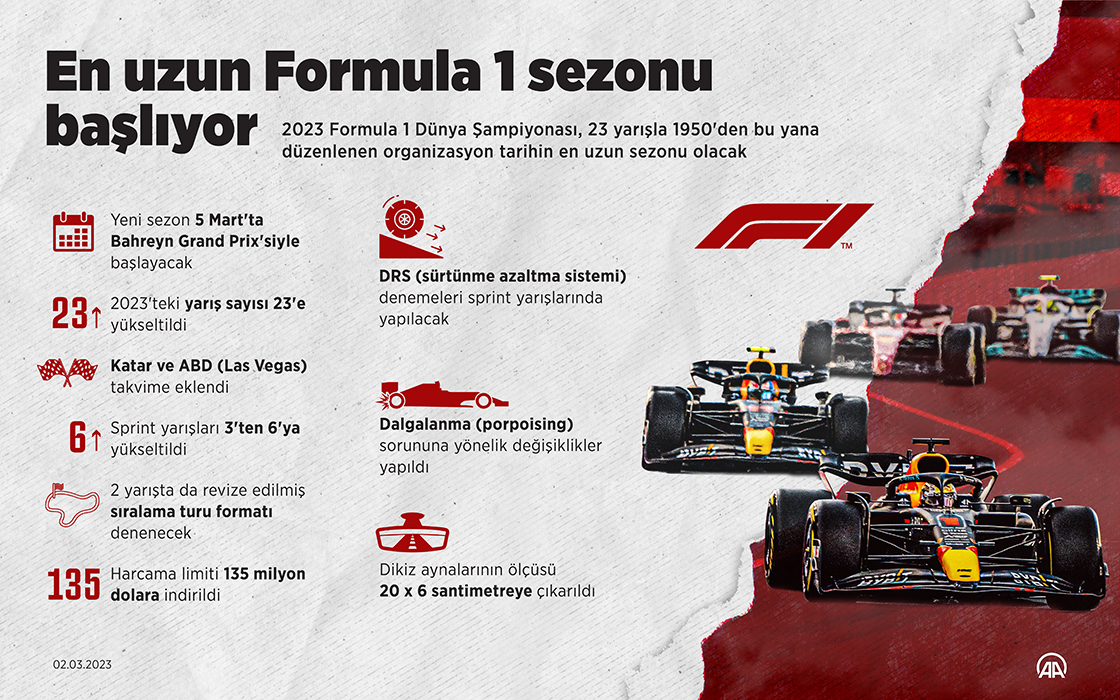 2023 Formula 1 Dünya Şampiyonası, 23 yarışla 1950'den bu yana düzenlenen organizasyon tarihin en uzun sezonu olacak. (Grafik: Muhammed Ali Yiğit/AA)